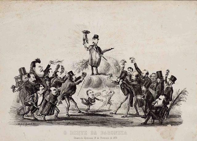 Gravura publicada na folha volante "O Dente da Baronesa", de 1870. Comentário humorístico à estreia da comédia do mesmo nome, da autoria de Teixeira de Vasconcelos e estreada no Teatro do Ginásio no mesmo ano. O dramaturgo surge glorificado sobre nuvens, empunhando numa mão um dente coroado, e na outra uma enorme pena de escrita. Em baixo, rodeiam-no confrades e amigos em aplauso e consagração, empunhando flores e coroas de louros. Entre eles, distinguem-se, à esquerda: Júlio César Machado, Luís Augusto Palmeirim, Eduardo Coelho, Rodrigues Sampaio (então ainda o terrível panfletário) e outros; à direita, Ramalho Ortigão, Pinheiro Chagas, Mendes Leal, Gervásio Lobato, Eduardo Vidal, Ernesto Biester, Luciano Cordeiro, entre outros. Ao centro, sob as nuvens que sustentam o homenageado, vê-se o escritor e empresário teatral Francisco Palha, expulsando Offenbach. Idêntica a MRBP.GRA.0912, 1505, 1506 e 1507.