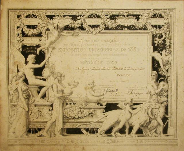 Diploma de medalha de ouro concedida a Rafael Bordalo Pinheiro (Grupo VII - Classe 69) pelo júri da Exposition Universelle de 1889, em Paris.