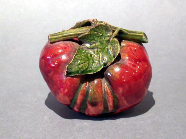 Ornato, moldado e modelado em brro vermelho, em forma de tomate com haste e folhas. Vidrado em tons naturalistas.