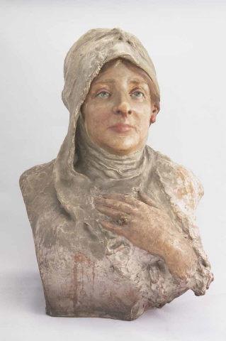 Busto modelado em barro vermelho representando a actriz Maria Visconti, com a cabeça e o rosto envolvidos por um manto e a mão esquerda sobre o peito. A obra é datada do dia da morte da Actriz, trata-se por isso de uma peça realizada postumamente (v. história da peça). A peça é policromada com tintas acuosas e apontamentos a óleo.