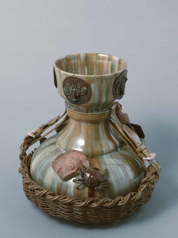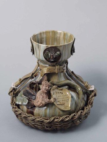 Jarra moldada e modelada em barro vermelho. Bojo achatado, gola muito elevada e boca cilíndrica ligeiramente divergente, com duas pegas laterais. Decoração com aplicações modeladas em alto-relevo, representando uma auto-caricatura de Rafael Bordalo Pinheiro, em busto, com rabo de peixe, em barro vermelho, não vidrado, segurando um coração côncavo, com a dedicatória incisa na pasta. Ao lado da figura de Bordalo, um peixe e uma enguia. Na face oposta, um medalhão miniatura, em barro vermelho, não vidrado, com cabeça de criança e um caranguejo. A base da jarra encontra-se inserida em cesta imitando o encanastrado, a qual é presa através de cinturão com fivelas, que se enrola no gargalo, formando assim as duas pegas. À volta da boca estão dispostos quatro medalhões miniatura, com lagosta sobre couve. O corpo da jarra é vidrado em tons de castanho com aplicações de escorridos, a restante decoração em tons naturalistas.