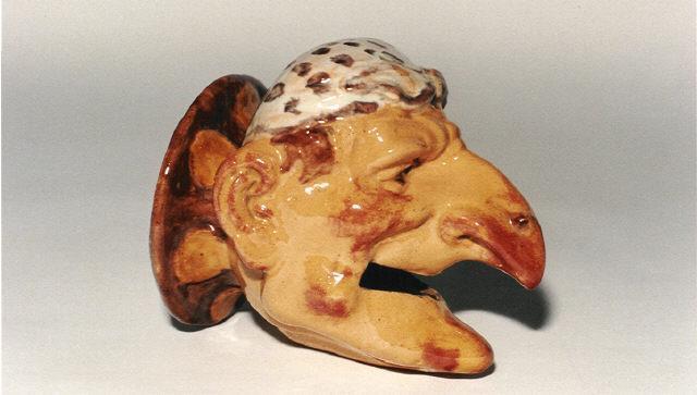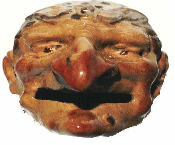 Mealheiro antropomórfico, moldado em barro vermelho, em forma de cabeça masculina idosa, representando um usurário Judeu, com lenço na cabeça. A boca apresenta-se aberta, em forma de ranhura para introdução das moedas. Assenta sobre base circular.