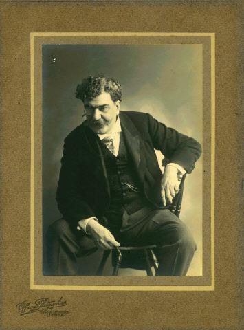 Reprodução fotográfica p/b de Rafael Bordalo Pinheiro colada sobre cartão com carimbo das Officinas Photographicas, 38 Praça dos Restauradores, de Arnaldo da Fonseca.