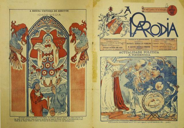 Capa e contracapa de "A Paródia", nº 144, 15/10/1902, p. 330, 331, 336, 337. Na capa (p. 330), desenho da autoria de Celso Hermínio, intitulado "Actualidade política. A regência", encimado pelo cabeçalho da dita publicação. Na contracapa (p. 337), desenho intitulado "A menina virtuosa de Arroios. Idade média", sem assinatura. Nas páginas centrais apresenta-se, na p. 331, um texto ilustrado, intitulado "Na véspera do milagre"; e ,na p. 336, dois desenhos, sendo que um, intitulado "Os boatos da crise", é da autoria de Celso Hermínio; o outro, da autoria de Pedro Cid, é intitulado "Perfil de Cascais". Sob estes, texto ilustrado, intitulado "O Lyceu...as costas", com desenhos de Jorge Cid. Anúncios. Folha dupla, solta.