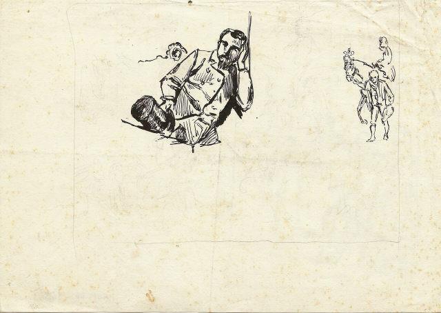Estudos de figura humana; à esquerda, figura masculina, encostada sobre o braço direito, segurando uma cartola na mão esquerda. À direita, figura feminina a cavalo, conduzida por figura masculina. No verso, esboço sumário de interior doméstico. (Estudos para ilustração de obras literárias ?).