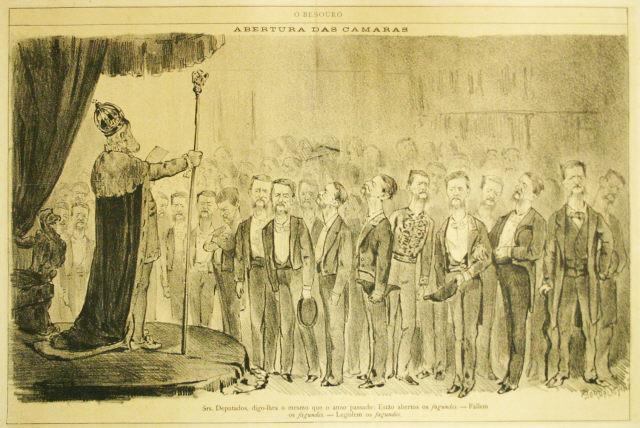 O imperador D. Pedro II do Brasil, em abertura de sessão parlamentar, dirige o seu discurso aos deputados, todos eles fisicamente iguais e de medíocres fisionomias, criaturas mais ou menos risíveis que Bordalo apelida de "os fagundes", assim criando uma personagem que apresenta afinidades com o conselheiro Acácio de Eça. Alusão à mediocridade e ao carreirismo da vida política e parlamentar brasileira, que Bordalo frequentemente parodiou. Aqui surgiu pela primeira vez esta personagem bordaliana do "fagundes", tantas vezes glosada pelo autor relativamente à pequena política brasileira. Publicada em "O Besouro", 14/12/1878. p. 292-293.