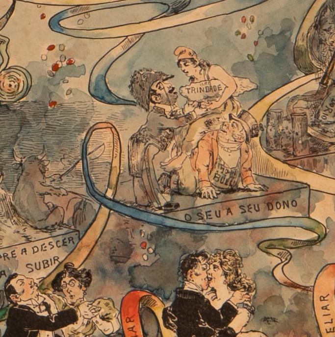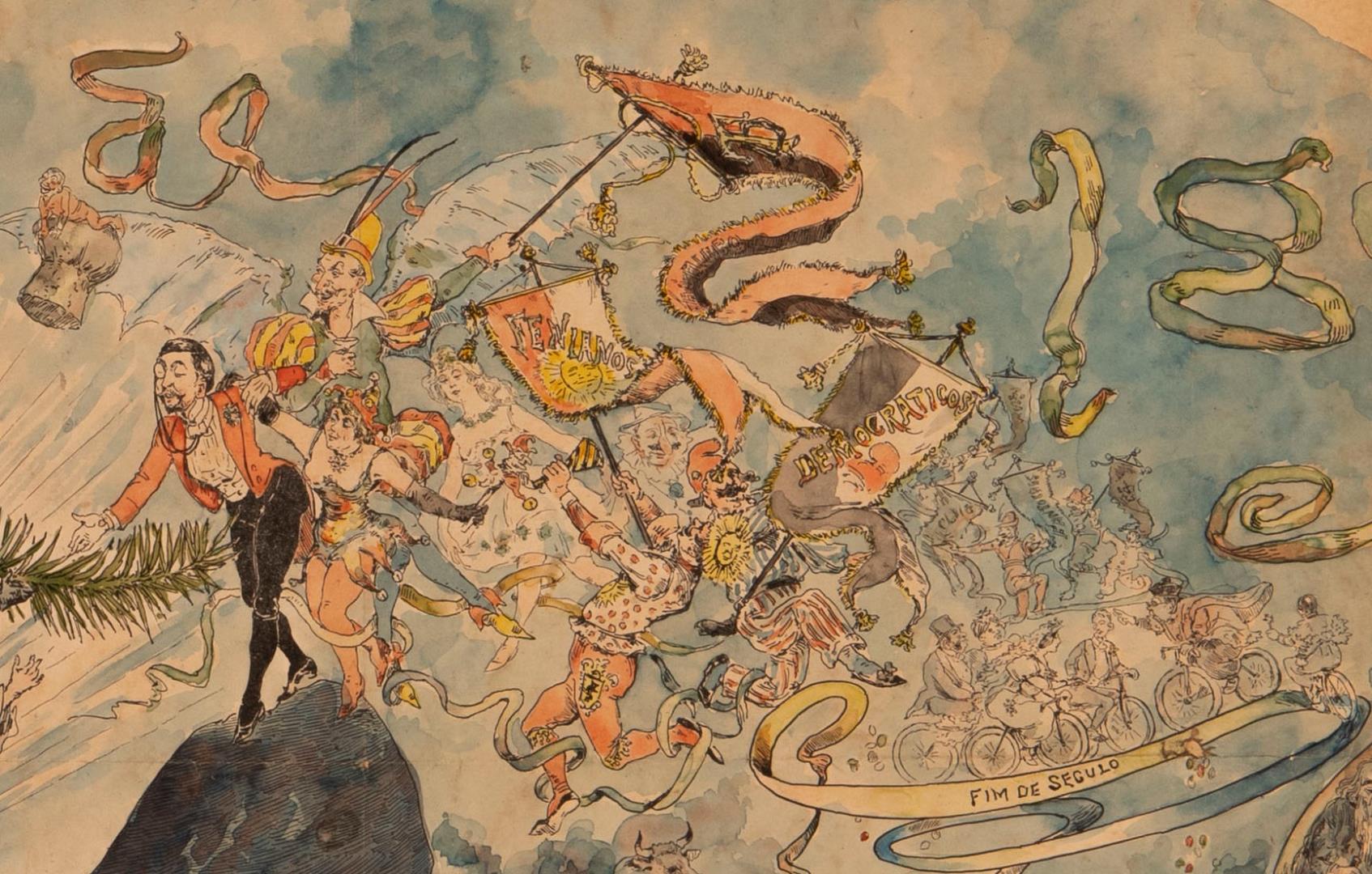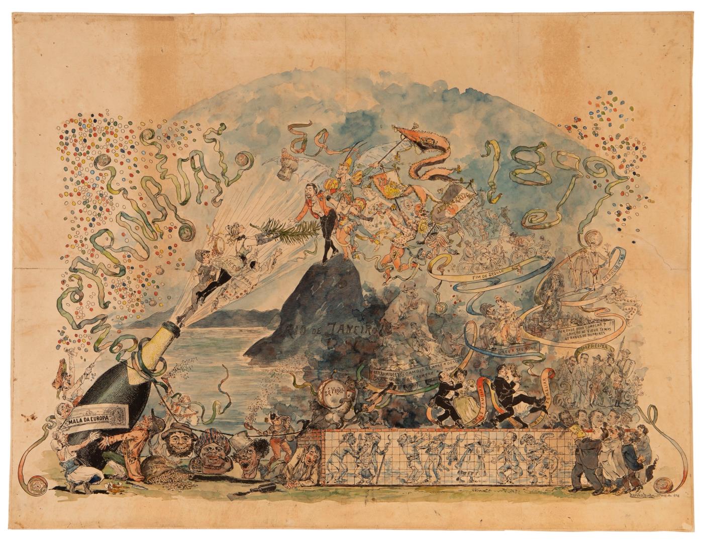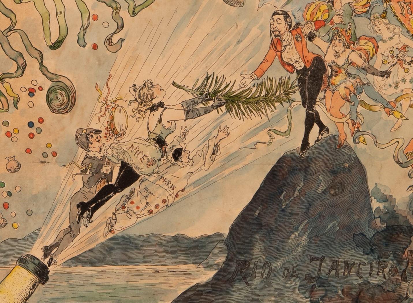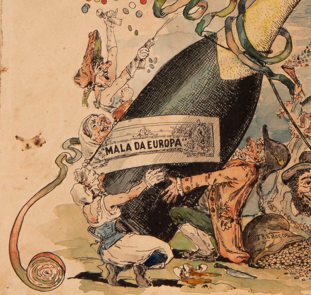 Desenho aguarelado feito por Rafael Bordalo Pinheiro para o periódico “Mala da Europa: Revista Quinzenal” (nº 70, 1897). No canto inferior esquerdo, uma grande garrafa de "champagne", com o rótulo "Mala da Europa", lança três mascarados (uma Colombina, um Pierrô e um Arlequim) ao cume do Pão-de-Açúcar, onde se encontra uma elegante figura masculina. Trata-se da personificação do Carnaval carioca que recebe dos históricos carnavais de Nice, Veneza e Paris uma palma, entregue como forma de elogio. Imediatamente a seguir, desfilam as três grandes sociedades carnavalescas (Tenentes do Diabo, Fenianos e Democráticos), acompanhadas por um corso com carros de sátira social e política. O ambiente é de animação e folia, esvoaçando pelo ar serpentinas e confetti. No campo inferior da composição encontram-se inúmeras referências ao Carnaval popular de Portugal e do Brasil: o “Chéché” lisboeta e o “Zé Nabo” do Porto, o “Zé Pereira” e os “cabeçudos”, com as caricaturas do Zé Povinho, da baiana e do carioca. Esta celebração do Carnaval Carioca deixa graficamente escrita a história desta festa, desde o violento e popular Entrudo de influência portuguesa até à feição cosmopolita e elegante que foi adquirindo a partir da segunda metade do século XIX. Obra doada ao Museu, em data anterior a 1919, pelo industrial Justino Guedes, proprietário da importante “Lithographia Guedes”, onde foi impressa grande parte da produção gráfica de Bordalo (Cruz Magalhães - Catálogo do Museu Rafael Bordalo Pinheiro, Lisboa, 1919).