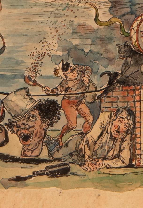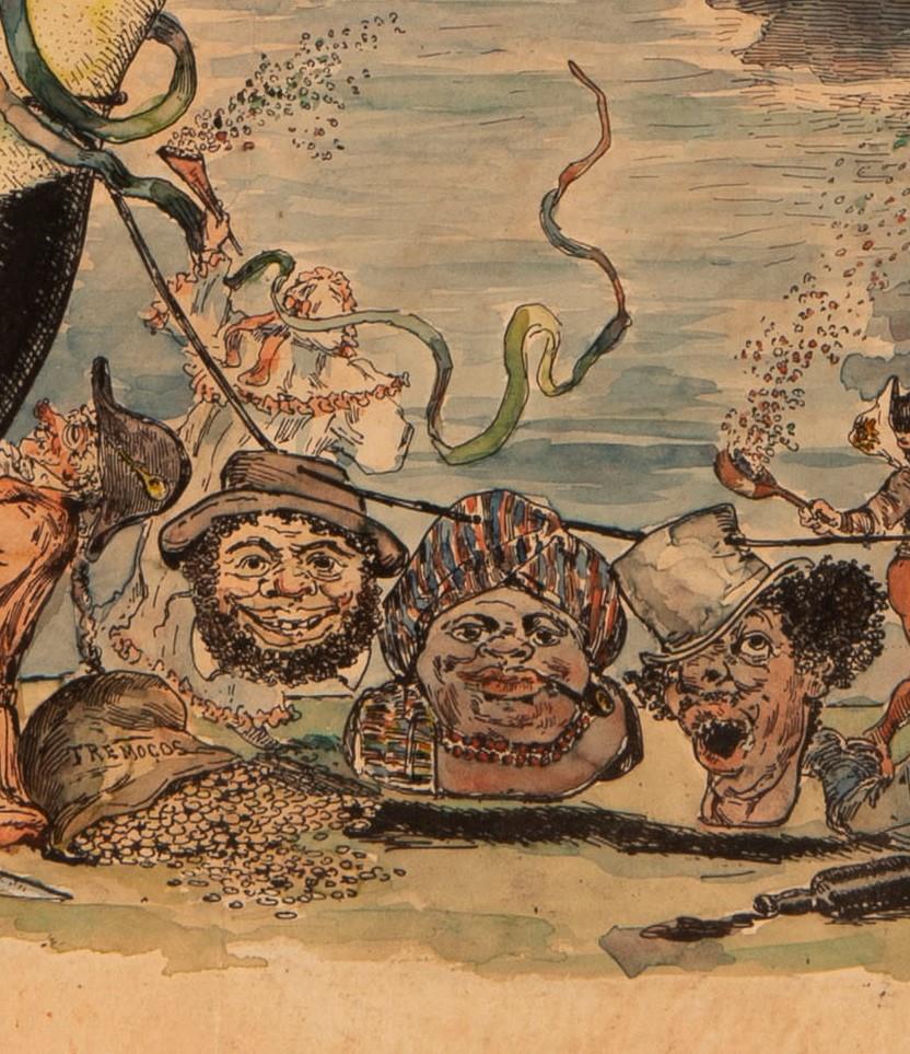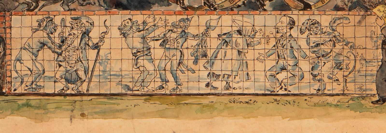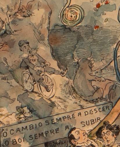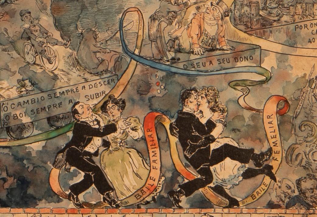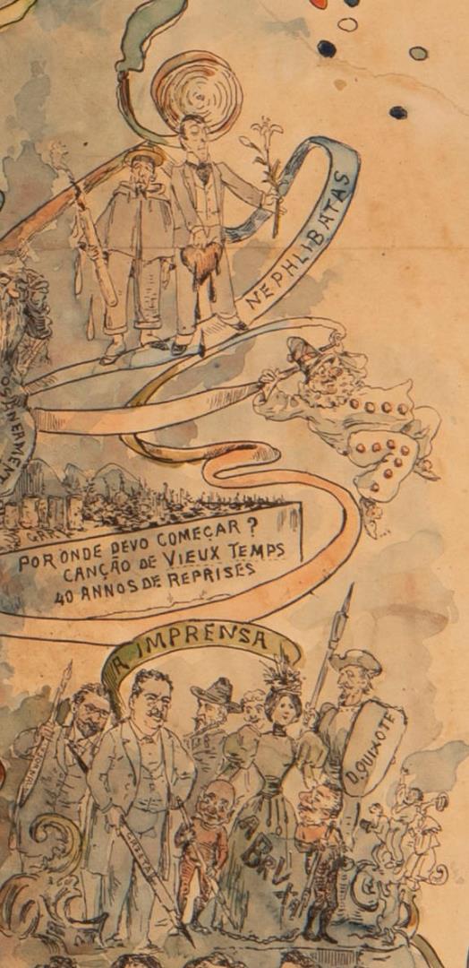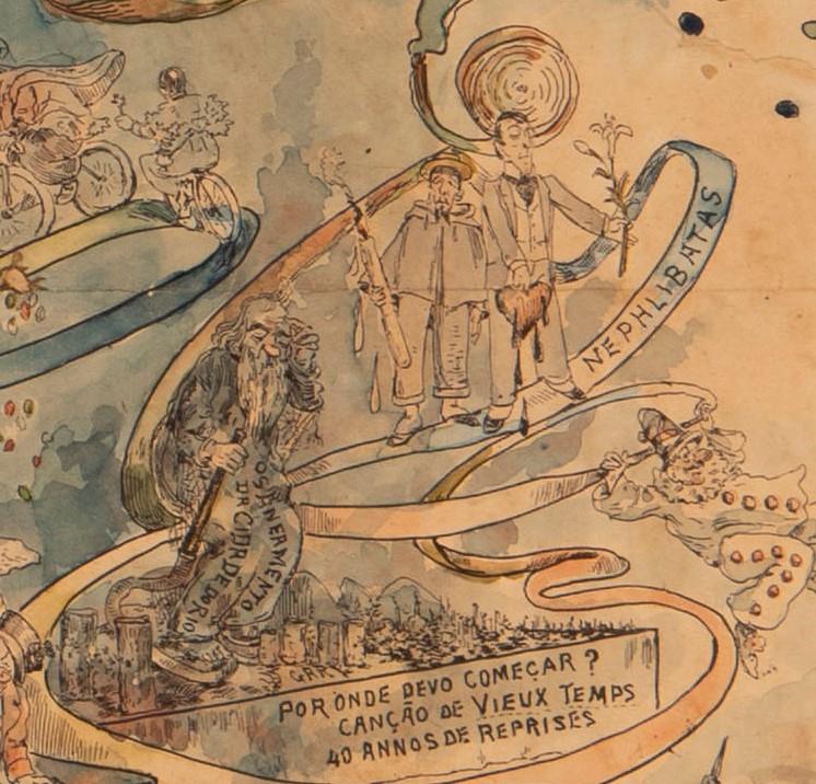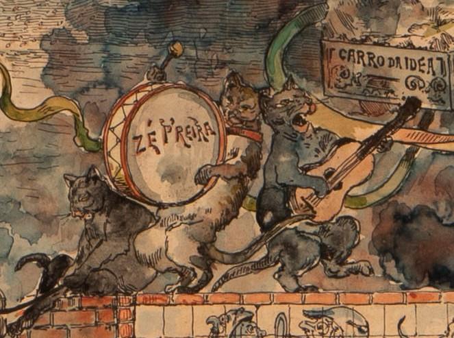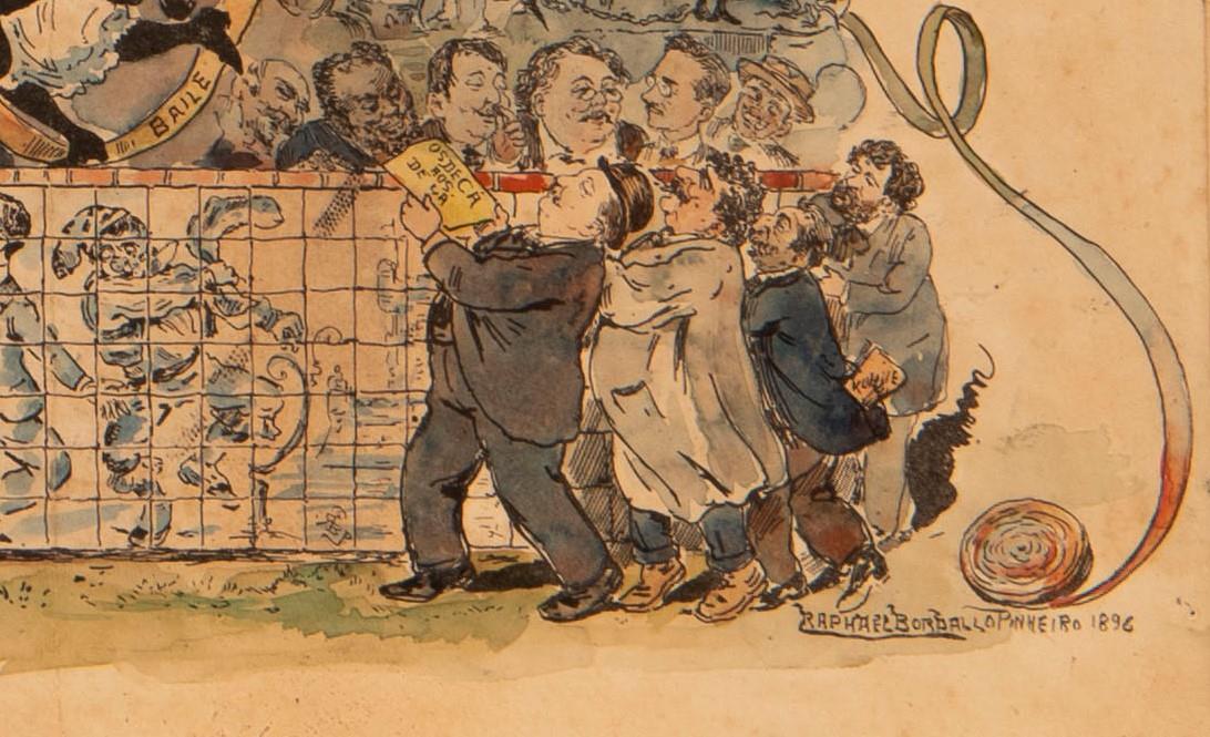 Desenho aguarelado feito por Rafael Bordalo Pinheiro para o periódico “Mala da Europa: Revista Quinzenal” (nº 70, 1897). No canto inferior esquerdo, uma grande garrafa de "champagne", com o rótulo "Mala da Europa", lança três mascarados (uma Colombina, um Pierrô e um Arlequim) ao cume do Pão-de-Açúcar, onde se encontra uma elegante figura masculina. Trata-se da personificação do Carnaval carioca que recebe dos históricos carnavais de Nice, Veneza e Paris uma palma, entregue como forma de elogio. Imediatamente a seguir, desfilam as três grandes sociedades carnavalescas (Tenentes do Diabo, Fenianos e Democráticos), acompanhadas por um corso com carros de sátira social e política. O ambiente é de animação e folia, esvoaçando pelo ar serpentinas e confetti. No campo inferior da composição encontram-se inúmeras referências ao Carnaval popular de Portugal e do Brasil: o “Chéché” lisboeta e o “Zé Nabo” do Porto, o “Zé Pereira” e os “cabeçudos”, com as caricaturas do Zé Povinho, da baiana e do carioca. Esta celebração do Carnaval Carioca deixa graficamente escrita a história desta festa, desde o violento e popular Entrudo de influência portuguesa até à feição cosmopolita e elegante que foi adquirindo a partir da segunda metade do século XIX. Obra doada ao Museu, em data anterior a 1919, pelo industrial Justino Guedes, proprietário da importante “Lithographia Guedes”, onde foi impressa grande parte da produção gráfica de Bordalo (Cruz Magalhães - Catálogo do Museu Rafael Bordalo Pinheiro, Lisboa, 1919).