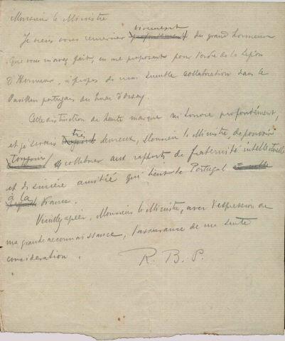 Carta (transcrição ou rascunho) de [Rafael Bordalo Pinheiro] para destinatário identificado apenas como "Monsieur le Ministre" Trata-se, provavelmente, do Ministro Francês dos Negócios Estrangeiros. Bordalo agradece a atribuição da Legião de Honra. Esta condecoração foi atribuida a Rafael Bordalo pelo governo Francês no final da Exposição Universal de Paris de 1889 onde o artista foi responsável pelo Pavilhão Português. Esta carta resposta deve ter sido escrita por Bordalo na sequência de uma outra, recebida do Ministério dos Negócios Estrangeiros Francês, enviando a referida condecoração e datada de 30 de Outubro de 1889 (Ver MRBP.ESP.DOC.747) pelo que a data deste rascunho deverá ser muito próxima.