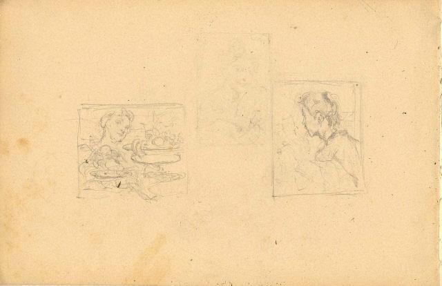 Estudo de medalhão circular com pintura decorativa (tecto do Museu Militar de Lisboa ?). No verso, à direita, estudo para o óleo "A chávena de Chá" (MNAC). À esquerda, estudo para o óleo "Natureza Morta" (MNAC); no centro, estudo de figura feminina para pintura não identificada. Encontra-se dentro de um álbum contendo outros desenhos de Columbano Bordalo Pinheiro (mrbp.des.2551 a 2580), inventariado com o nº Inv. MRBP.EQU.UTE.0119.