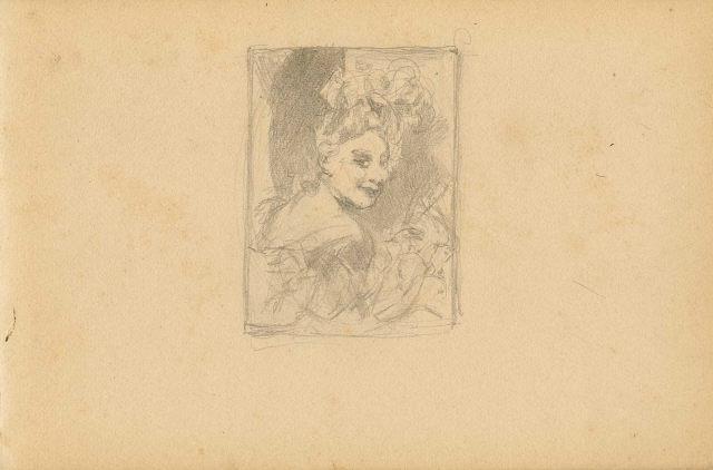 Estudo a carvão, representando figura masculina e outra feminina, junto a uma mesa (familia do artista?), muito sumário. No verso, estudo para retrato de figura feminina, espreitando sobre o ombro. Encontra-se dentro de um álbum contendo outros desenhos de Columbano Bordalo Pinheiro (mrbp.des.2551 a 2580), inventariado com o nº Inv. MRBP.EQU.UTE.0119.
