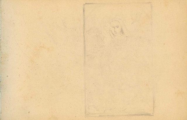 Estudo representando Cristo na cruz, ladeado à esquerda e à direita pelos dois ladrões crucificados, em baixo, diversas figuras, entre elas, Maria Madalena e Nossa Senhora. No verso, estudo para retrato de figura feminina. Encontra-se dentro de um álbum contendo outros desenhos de Columbano Bordalo Pinheiro (mrbp.des.2551 a 2580), inventariado com o nº Inv. MRBP.EQU.UTE.0119.