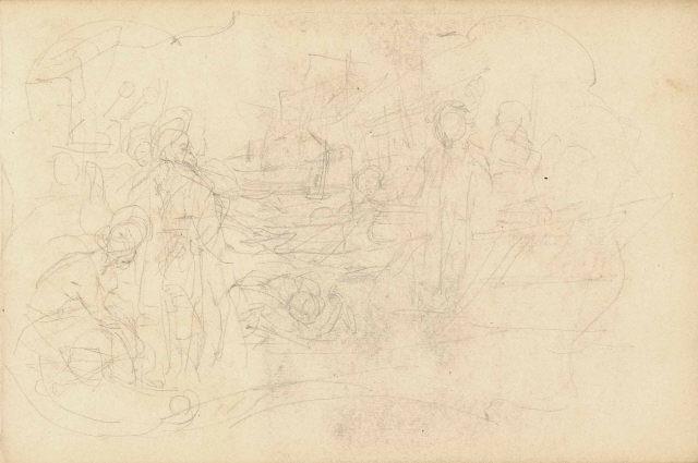 Estudo para episódio das "descobertas" portuguesas, representando diversas figuras e embarcações à vela (Museu Militar de Lisboa?). No verso, estudo para retrato de figura feminina (Rainha D. Maria Pia?). Encontra-se dentro de um álbum contendo outros desenhos de Columbano Bordalo Pinheiro (mrbp.des.2551 a 2580), inventariado com o nº Inv. MRBP.EQU.UTE.0119.