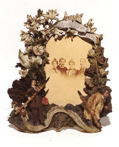 Moldura para fotografia, modelada em barro vermelho, dedicada a D. Elvira Bordalo Pinheiro, esposa do artista. A moldura é constituida por uma composição floral e vegetalista partindo da base, na qual aparecem duas auto-caricaturas de Rafael Bordalo Pinheiro: à esquerda, o artista aparece representando de fato, com um grande pincel em riste e acompanhado de um gato; à direita, já com ar muito agastado e envelhecido, representa-se com bata de trabalho e com um pincel descaído. Entre estas duas representações, filactera com a dedicatória riscada na pasta. A encimar e unindo os dois lados da moldura, filactera com a data inscrita. Mais uma vez, Bordalo mostra-nos nesta peça, a sua grande facilidade em se caricaturar.