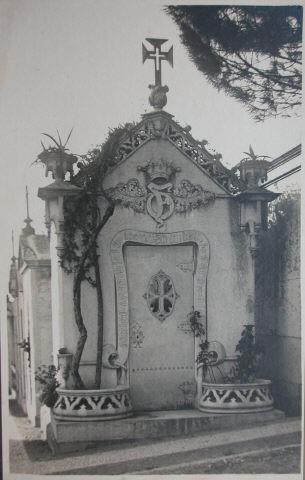 Jazigo de Família dos Viscondes de Faro e Oliveira no cemitério dos Prazeres, onde se encontra sepultado Rafael Bordalo Pinheiro. Fotografia a p/b. O jazigo passou a ser objecto de romagem anual por parte de familiares, admiradores e amigos do artista. Foi Bordalo quem desenhou este jazigo, o que poderá ser um dos motivos que justifica o facto de ter sido sepultado neste local, além da amizade que o ligava àquela família.