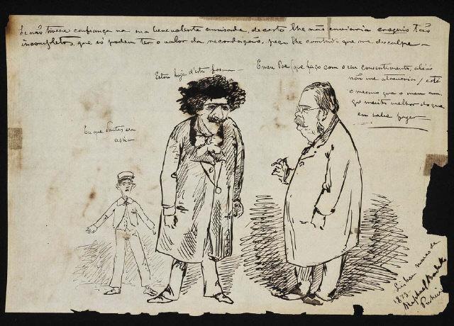 Auto-caricatura de Rafael Bordalo Pinheiro, retratado junto a seu pai. De uma forma algo naif , uma representação sua anterior. A explicação da intenção do desenho manuscrita, com informações indispensáveis para a sua compreensão.