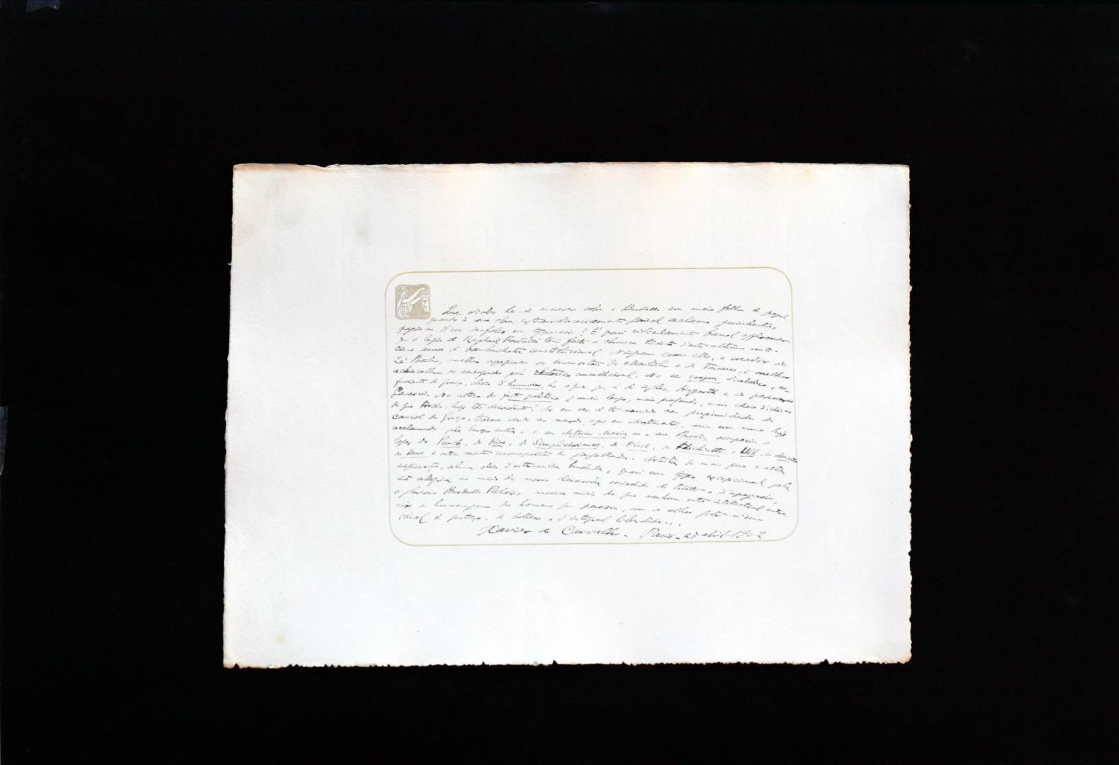 Folha de papel litografado, com texto manuscrito a tinta, assinada e datada Abril 1902, expressando a homenagem do seu autor Xavier de Carvalho a Rafael Bordalo Pinheiro. Este manuscrito faz parte do Album de Homenagem a Rafael Bordalo Pinheiro, que foi organizado pela Associação de Jornalistas de Lisboa e entregue ao artista em sessão solene de 6 de Junho de 1903, que decorreu nas salas do jornal Diário de Noticias, seguida de um banquete de homenagem no Teatro Nacional D. Maria II, com a presença de mais de 200 convidados de variados estatutos e sectores politicos, culturais e sociais. A folha de papel litografado, que serve de suporte ao texto manuscrito, foi desenhada e concebida por Alfredo Roque Gameiro, especificamente para os colaboradores inscreverem as suas impressões de homenagem ao artista, sendo os exemplares impressos na Tipografia Universal, sita á época na Rua do Diário de Noticias, 110.