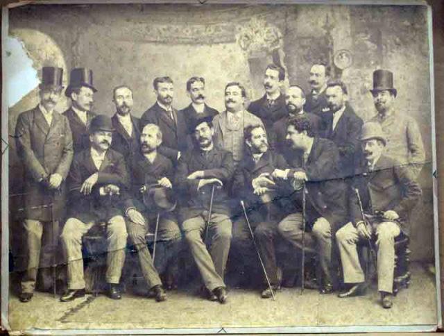 Retrato de grupo tirada no dia da recita da peça O Comissário de Policia da autoria de Gervásio Lobato [em 1890]. Na foto da esquerda para a direita - em pé: Eça Leal, Lorjó Tavares, Agostinho Franco, Eduardo Swalbach, actor Augusto Melo, C. Ribeiro da Silva, Pedroso Lima, Moura Cabral, Acácio Antunes e Augusto Lobato; sentados: Jorge Victor, Henrique Lopes de Mendonça, D. João da Câmara, Caetano Alberto, Rafael Bordalo Pinheiro e D. José da Câmara.